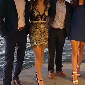 Elegant black dress with intricate gold sequin detailing. Features a backless design. Perfect for evening events. It does shed the glitter. Only worn once. Says medium but fits like a small. Waist is about 14 inches. Pit to end is about 18.5 inches.