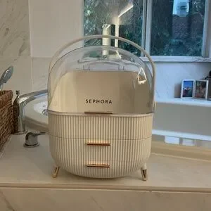 Stylish Sephora organizer with cream finish and gold handles. No longer sold. Ideal for makeup and skin care storage.