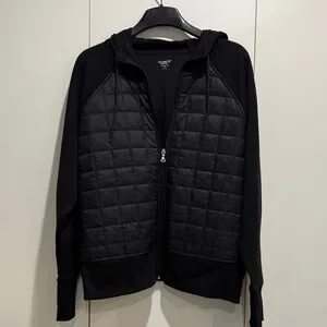 Sleek black jacket with quilted design. Features a hood and zip closure. Ideal for layering.