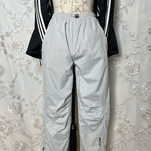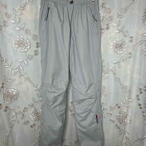 These Reebok size S, gray ski pants are super lightweight! They’re in great condition. They have zipper pockets, zippers at the bottom of the legs for more room to put over skis. It has an elastic waste and is relatively waterproof. They do come with a matching size small orange, Reebok pullover sweatshirt. You will get a discount if you buy the pair!