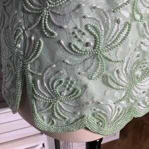 Vintage beaded and sequined blouse with shiny lime green short sleeves and scalloped hems in size XL.