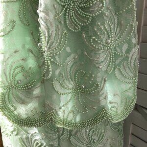 - V neckline with scalloped hemline beaded all around with tiny pearl-like lime green beads