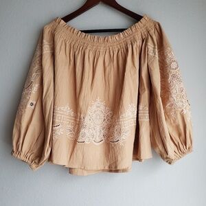 With intricate machine embroidered detailing against a warm pastel malt colour, a shirred neckline, in a heavy draped cotton, this top will make a statement whether you pair it with a cute pair of denim shorts or a floaty maxi skirt.