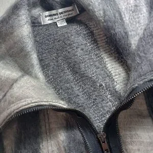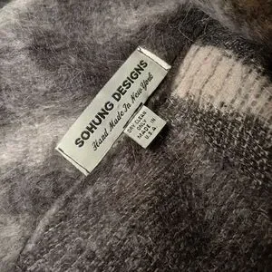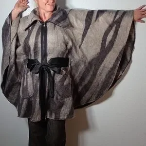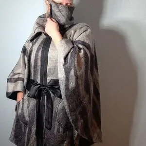 A striking 360° cape from Sohung Designs in New York, this wool tie-back is theatrical and eye-catching, even with its monochrome pallet. The black and grey neutrals are cosmopolitan, ready to blend in on the streets of New York or Europe, even while the bold abstract pattern refuses to be ignored.