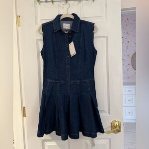 Sleeveless denim mini dress. Button-down front. Pleated skirt. Classic collar.