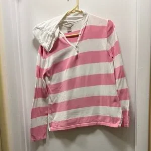Stylish pink and white striped hoodie. Features a comfortable hood and button details. Perfect for casual wear.