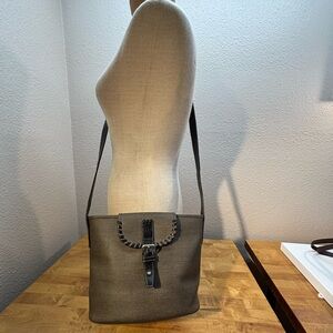 Chic Fendi crossbody bag. Black leather strap with brown fabric body. Ideal for versatile styling.