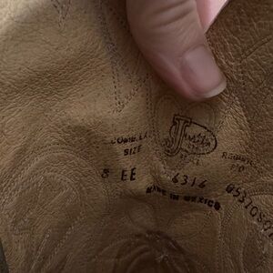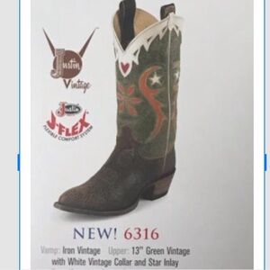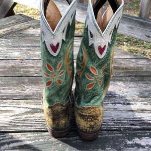 Gorgeous Justin 6316 cowboy boots with a cactus green and tan suede with gold, red, white inlays. Stars and hearts, these are of the high end “Vintage collection” by Justin, and made in Mexico. They really look more like old gringo boot style.