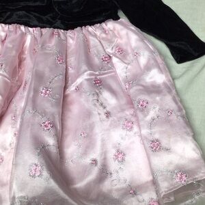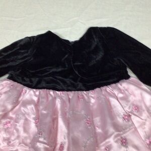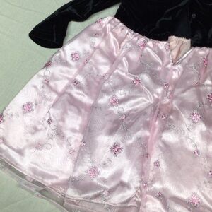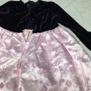 Elegant black velvet top with a satin pink floral skirt. Perfect for special occasions.