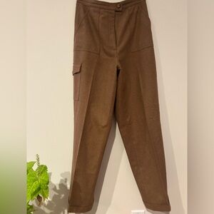 Warm and stylish brown wool-blend trousers with a relaxed straight-leg fit and a cargo side pocket. Soft acetate lining, front button/zip closure, great for fall and winter. Gently worn, excellent condition.
