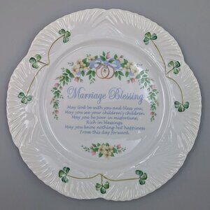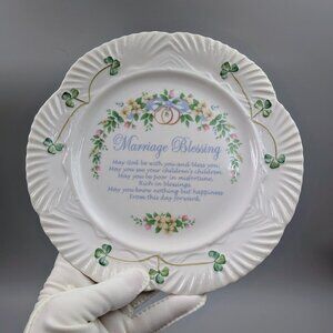 Celebrate love and tradition with this exquisite Belleek Classic Marriage Blessing Plate, handcrafted in Ireland from the finest Parian China. Belleek pottery has been cherished by collectors and gift-givers worldwide since 1857. This plate features the timeless Irish Marriage Blessing, beautifully accented with hand-painted shamrocks, symbolizing luck, prosperity, and happiness. A thoughtful keepsake for weddings, anniversaries, or new beginnings, it makes a meaningful gift that will be treasured for years to come. Bring the spirit of Ireland and the warmth of a timeless blessing into your home with this stunning Belleek Classic plate. Plate is about 8.75". Belleek backstamp on underside of plate.