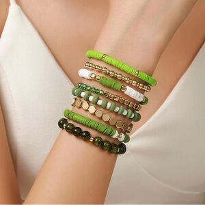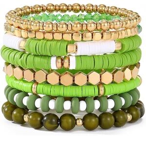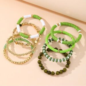 Add a pop of color with this vibrant green and gold bracelet set. Perfect for any occasion.