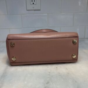 Authentic designer Michael Kors Cynthia Pink smooth leather chain Satchel in EUC. This satchel is characterized by its structured silhouette and is crafted from Michael Kors, offering a sophisticated and recognizable aesthetic. It features dual top handles with chain-link detailing, incorporating both gold-tone hardware and a tortoise acetate-like finish on some links, providing a tactile and polished look. Polished gold-tone hardware is prominent, including the chain links, handle attachments, and four protective metal feet on the base of the bag. A distinctive round "MK" logo charm hangs from one of the handle attachments. The Cynthia satchel is designed for organization, typically featuring a spacious, lined interior divided into multiple compartments, including a central zippered compartment and additional slip and zip pockets for essentials. The main compartments often have magnetic snap fastenings, while the central compartment secures with a zipper. Approximate measures -11" x 9.5" x 4" Strap drop -9"