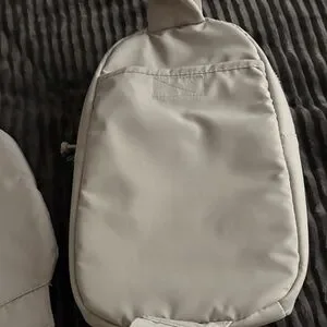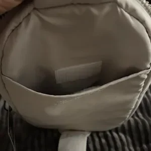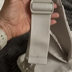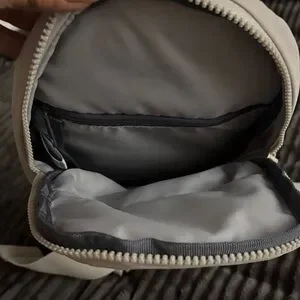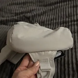 Official color- wonder alumina grey with two outside pockets and main compartment plus a zipper pocket inside. Key leash too. Key hook on crossbody strap. Strap is adjustable. There is also a zipper holder on strap. Perhaps for a phone or glasses.