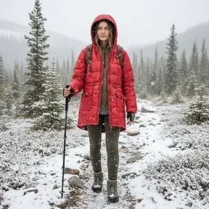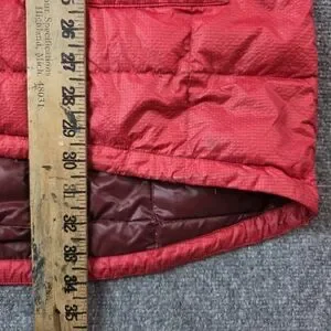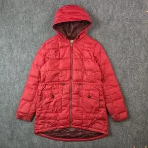 Stylish red puffer jacket. Features a hood and front pockets, along with side pockets. Slightly longer in back. Warm, sporty and packable for travel.