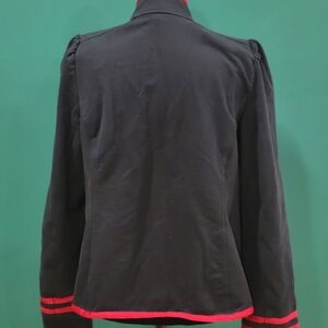 Elegant navy blazer with striking red trim. Features gold buttons for a classic look.