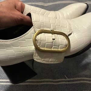 Beautiful and elegant booties, croc looking leather, big gold buckle. They sadly don’t fit me anymore as my feet grew with pregnancy.
