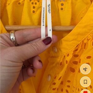 Vibrant sunflower blouse with eyelet details. Button-up style.