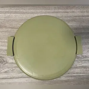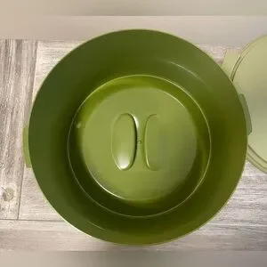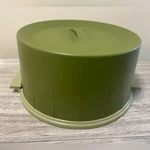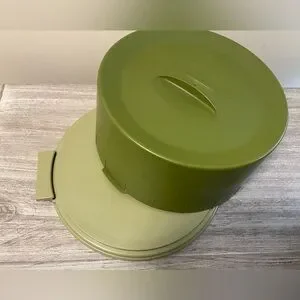 Cake carrier is not marked but is reminiscent of Tupperware. Measures approximately 6 1/2” high by 11 1/2 wide not including handles on base. There is some very slight discoloration. I had to put a bright light on it to make it show in the picture. It is not as obvious as it looks in the pic.