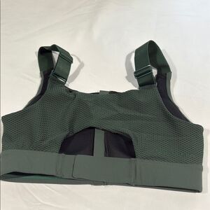 Stylish dark green sports bra featuring a front zipper. Perfect for workouts.