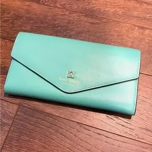 Chic Kate Spade wallet in a refreshing aqua hue. Sleek design with a classic envelope style. Perfect for adding a pop of color.
