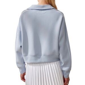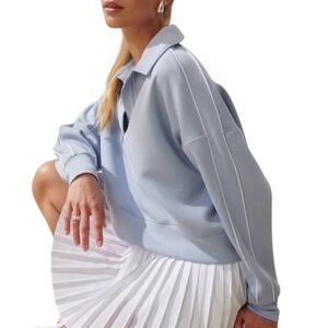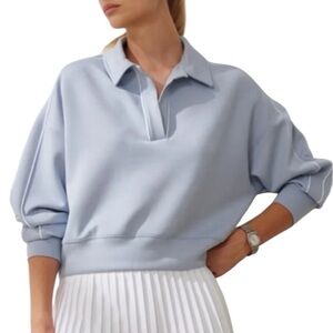 “This sleek YPB neoKNIT Polo Sweatshirt from Abercrombie's Your Personal Best line is crafted in a soft-yet-structured neoprene-inspired fabric that's smooth on the inside and refined on the outside. Designed with a flattering Johnny collar, 4-way stretch, and a boxy core length silhouette, it blends comfort with performance. Whether you're heading to brunch, the gym, or a travel day, this sweatshirt keeps you looking sharp and feeling great.”