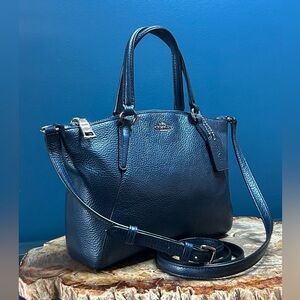 This Coach Mini Kelsey Crossbody Satchel was made in 2017, Style F22316, of Midnight Blue Metallic Pebble Leather and Nickel Silver Hardware and is in excellent, like new, pre-loved condition.