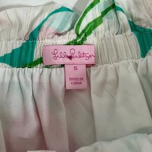 Lilly Pulitzer bright pink and white and green floral skirt in size small. This has gold threads through the pattern. Elastic waist from 14 inch to 16 inches. Front and side pockets. Lined. Self tie belt. Very pretty. Clean new condition.