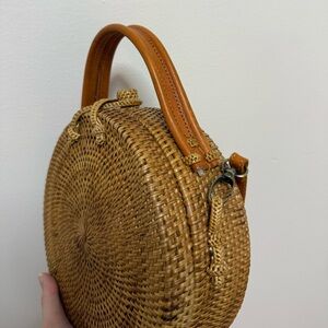 Stylish and versatile round woven crossbody bag in a classic tan color. Perfect for casual outings and adding a touch of elegance to any outfit. In great condition. Strap is removable
