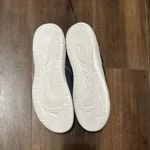 Stylish navy loafers with tan accents. Comfortable slip-on design. Perfect for casual wear. New never worn