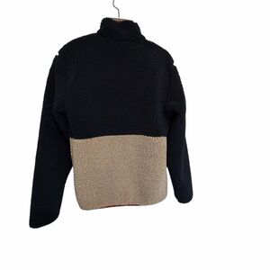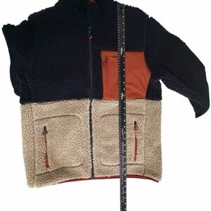 Cozy sherpa- like jacket with a stylish color block. Features a zip pocket and warm material. Ideal for chilly days.