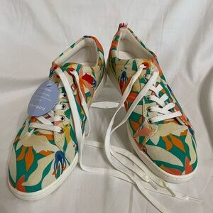 Canvas sneakers with a vibrant mix of colors. Features floral patterns. Comfortable and stylish for everyday wear.