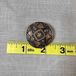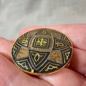 Most likely made in Spain, with a style reminiscent of Moorish design, it has a beautiful look and finish. Traditional damascene made disk, cased in a gold plated metal pin with a trombone style back. Not marked, it measures about 2-1/4" in diameter. In very good condition, it has the traditional black and gold, but also a bronze color as well. A gorgeous brooch!