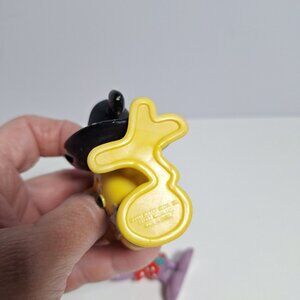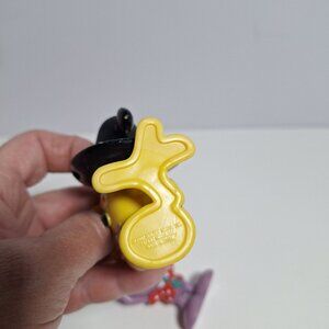 Small discoloration marks on purple figure's back. Yellow figure shows minor wear on the black hat. There are a couple other scratches, including one on the purple figures eye. See the pictures to see the other paint chips.