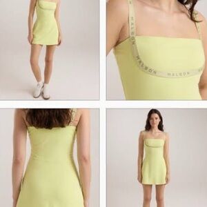 Chic and stylish mini dress by Malbon. Features a soft yellow color and strappy design. Perfect for a modern golf look.