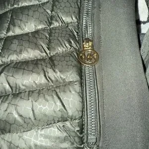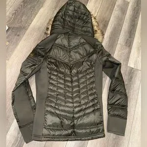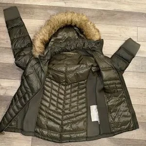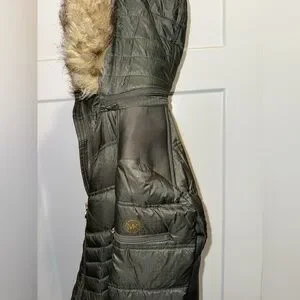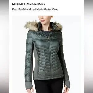 Chic green puffer jacket by Michael Kors. Features luxurious fur trim. Ideal for cold weather.