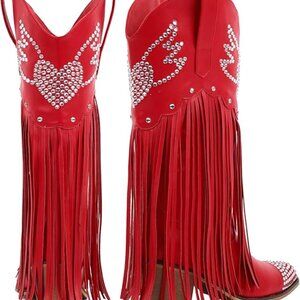 Cowboy Boots for Women Red Cowgirl Boots with Fringe Rhinestone Hearts