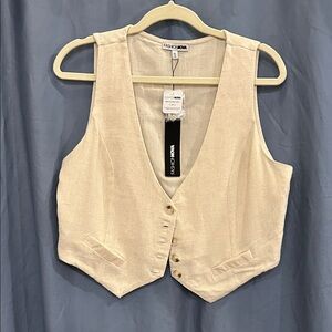 Chic cream pantsuit with vest. Perfect for stylish occasions.