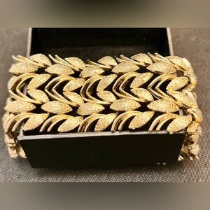 Stunning Coro vintage jewelry features a wide, silver/gold tone textured Florentine finish bracelet