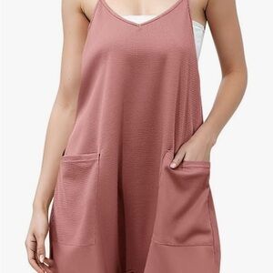 This pink romper features thin spaghetti straps and a flattering V-neckline, offering a relaxed fit. Its soft, flowing 100% waffle knit polyester fabric ensures comfort and ease, making it an ideal casual outfit.