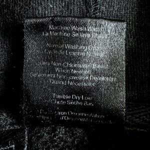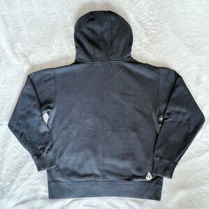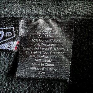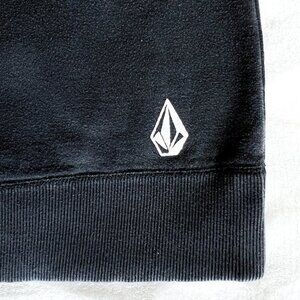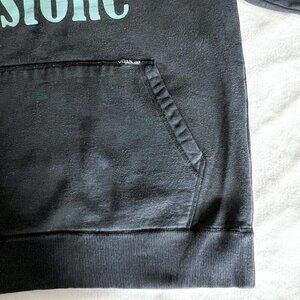 Men's Volcom Stone hooded sweatshirt. Black color sweatshirt. Large printed graphic of brand name on front. Front pouch pocket with small Volcom label sewn on at top left of pocket. Small logo printed on bottom back, right side of sweatshirt. Size small. 80% cotton 20% polyester.