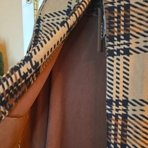Elegant plaid poncho with open front. Features tan and black check pattern. Perfect for layering.