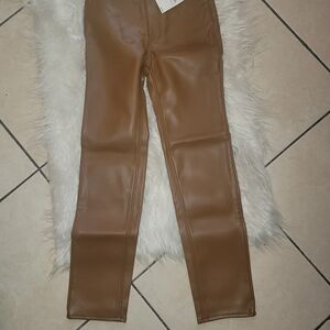 Chic tan faux leather trousers. Ideal for a modern look.