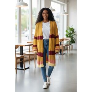 Keywords: yellow cardigan, knit duster, striped sweater, bohemian cardigan, long sleeve cardigan, open front cardigan, boho sweater, festival style, casual outerwear, longline cardigan, burgundy stripes, ombre hem, womens cardigan, bohemian style