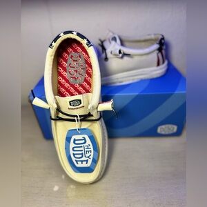 Brand new Hey Dude Wally slip-ons in the Americana Stars & Stripes design.