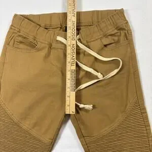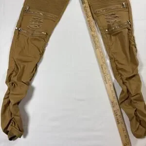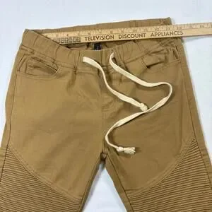 ✓ Brand: American Bazi✓ Size: Men’s Medium✓ Color: Tan✓ Material: 97% Cotton, 3% Spandex✓ Features: Moto ribbed panels, distressed knees, zip details, jogger waistband✓ Condition: Good; intentional distressing