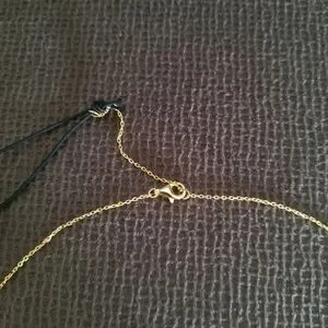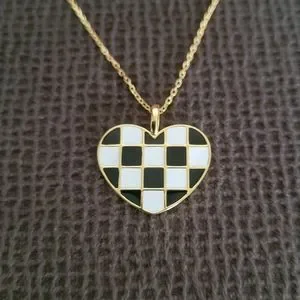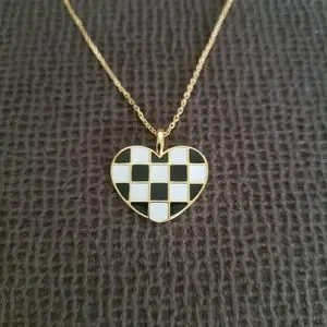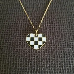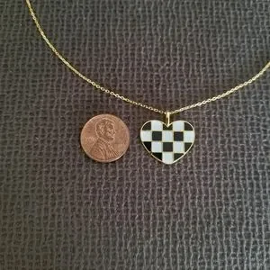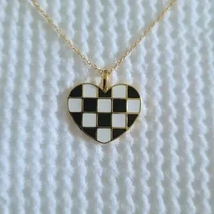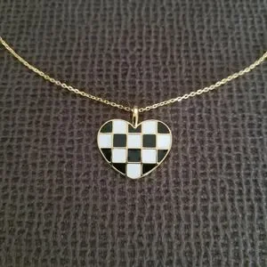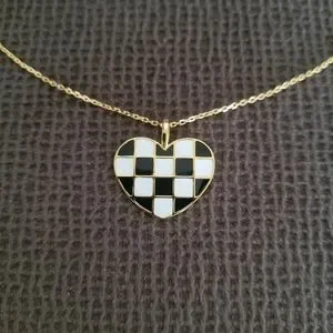 A black and white checkered enamel heart♥️ pendant on a gold💛 cable chain