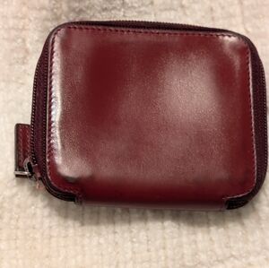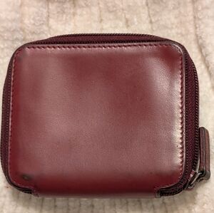 Compact burgundy leather zip coin pouch with zip around closure. Sleek and stylish design. Vintage in good condition.