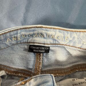 These American Eagle Mom Jeans in size 0 feature a high-rise fit with a 13-inch waist and a 29-inch inseam. Made from light-wash denim, they have a regular fit and include a comfort stretch waistband. The jeans are accented with a ripped and distressed design, offering a solid pattern and a zip closure. They are crafted from cotton and are not vintage or handmade. This item is pre-owned.