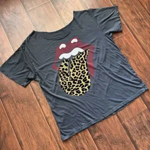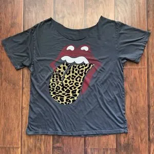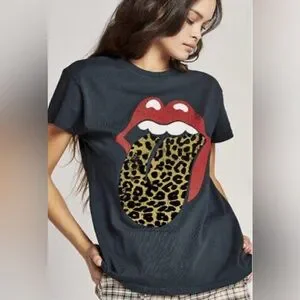 Sold at Free People -Daydreamer Brand Rolling Stones Band T-shirt. Relaxed fit women's Size Small. Black velvet animal/cheetah print in the tongue. Dark charcoal grey color. Super cute!!